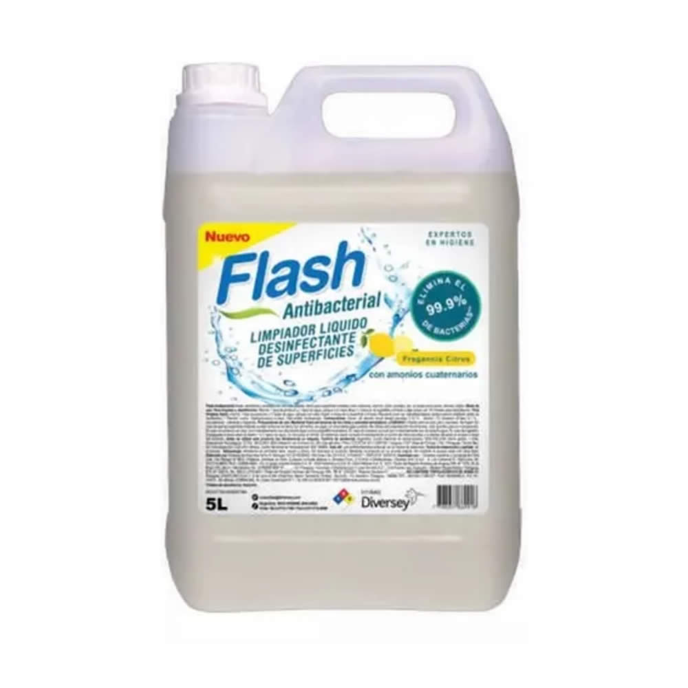 Limpiador líquido desinfectante de superficies. Limpia, desinfecta y aromatiza en una sola pasada. Elimina el 99.9% de bacterias. Fragancia Citrus con amonios cuaternarios. Contiene 5 litros.